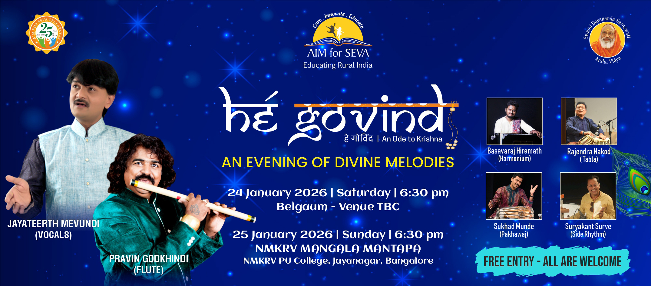 ‘Hé Govind’ is a soulful musical journey that transports the listener to the divine realm of Lord Krishna. The concert is designed as a celebration of Sri Krishna, with a selection of bhajans and abhangs, which are all in praise of the divine presence of the beloved Lord. The music is a blend of classical and semi classical styles, creating a unique and mesmerizing feeling that is sure to captivate the audience – presented by Jayateerth Mevundi, Pravin Godkhindi and a host of accompanying artistes. The songs are chosen from among the compositions of popular saints and seers of India – including those by our beloved Founder, Pujya Swami Dayananda Saraswati.